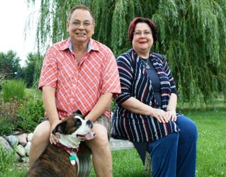 Mandy with Prof. Minna Rozen of Haifa University. With them is Venus, a matriarch to a tribe of 15 boxers.
